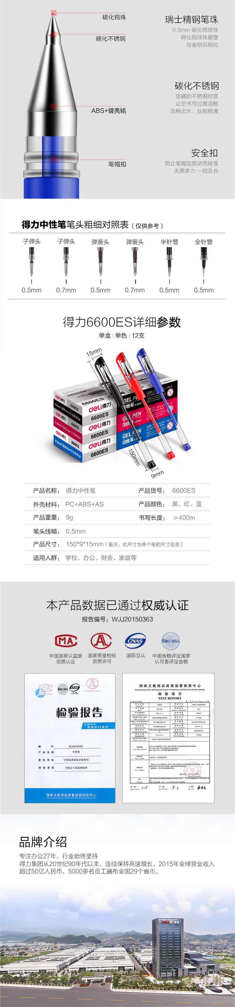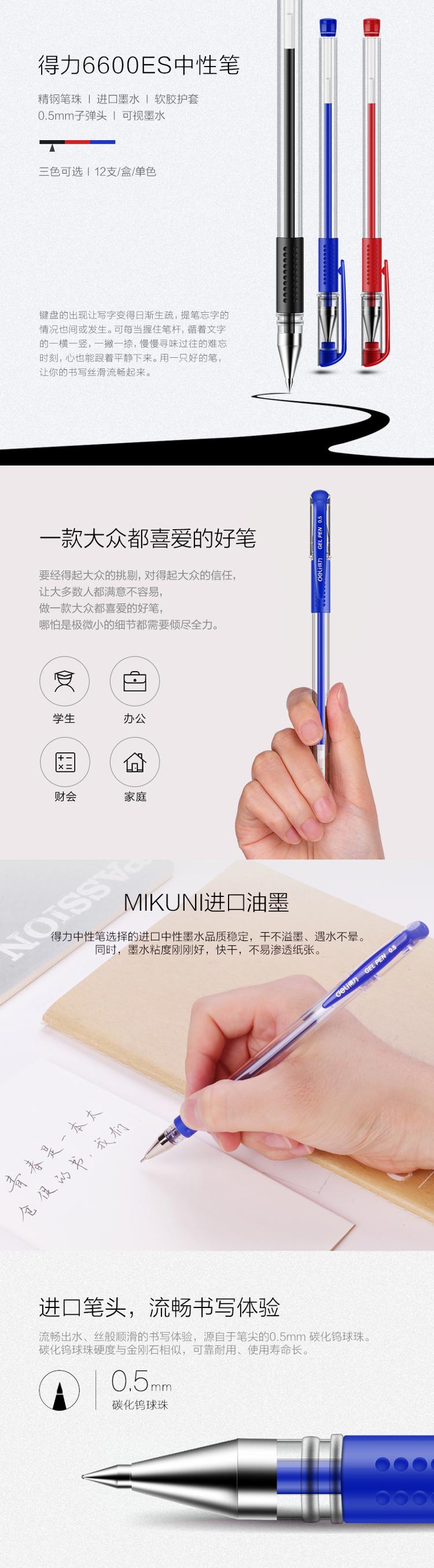 • 商品名称:得力(deli)6600ES 经典办公中性笔子弹头水笔签字笔 0.5mm 12支/盒 蓝色