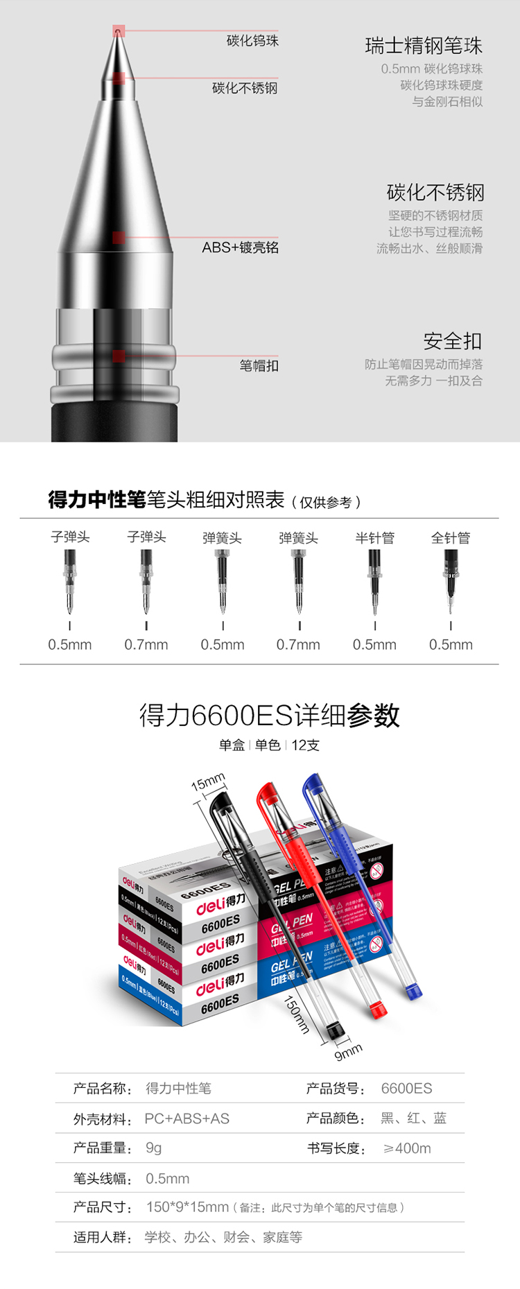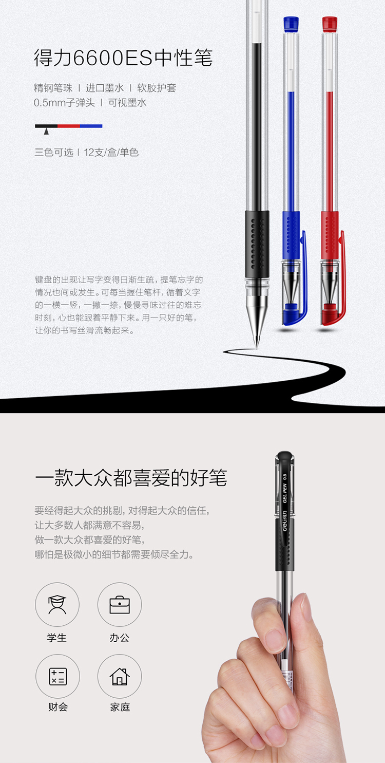 • 商品名称:得力(deli)6600ES 经典办公中性笔子弹头水笔签字笔 0.5mm 12支/盒 黑色