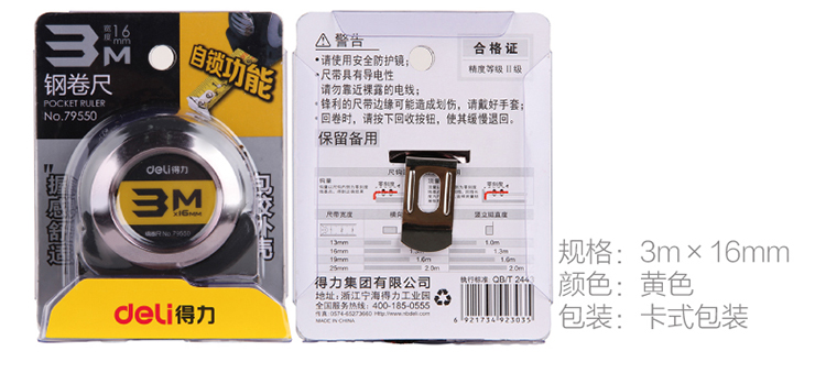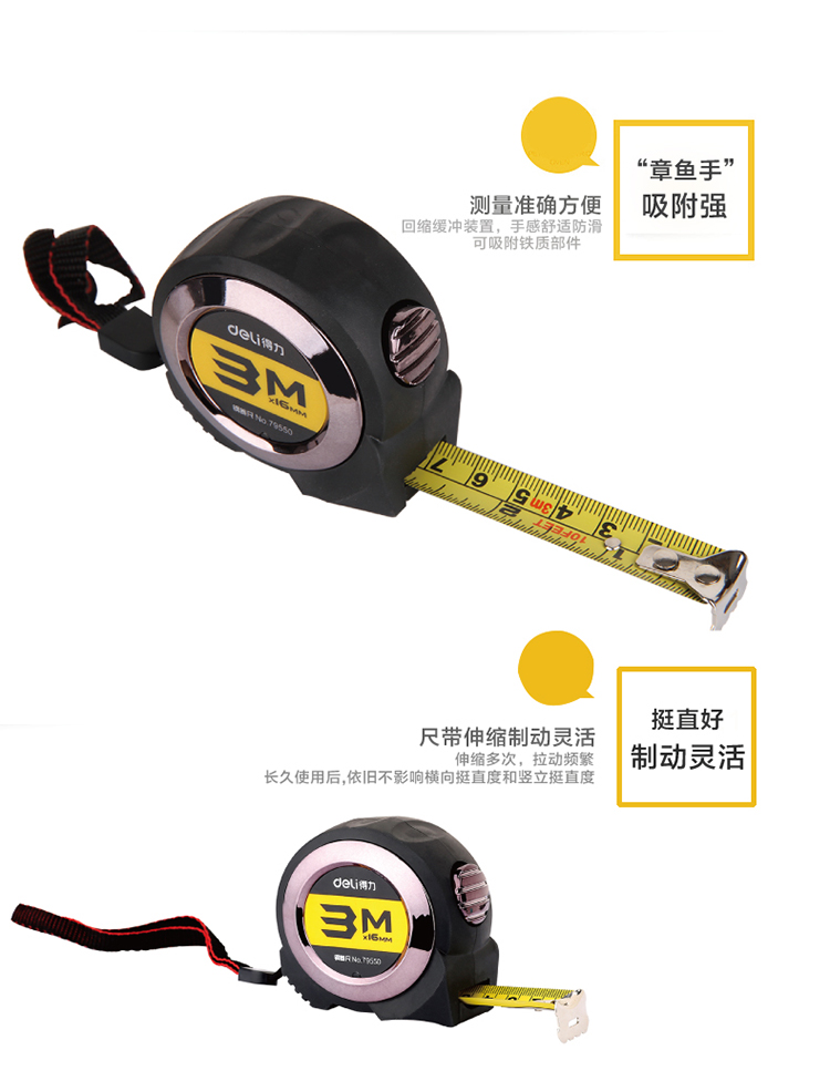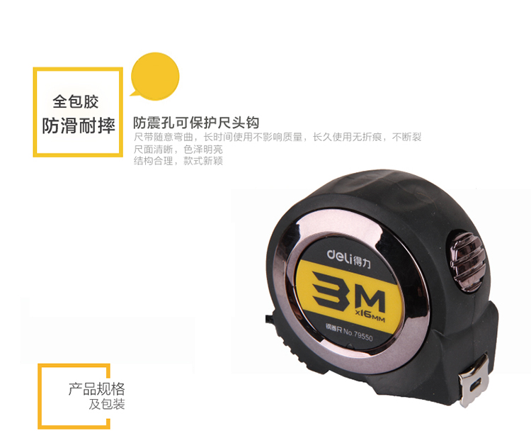 • 商品名称:得力(deli)79550 3m全包胶自锁钢卷尺/尺子 精度等级Ⅱ 黑色