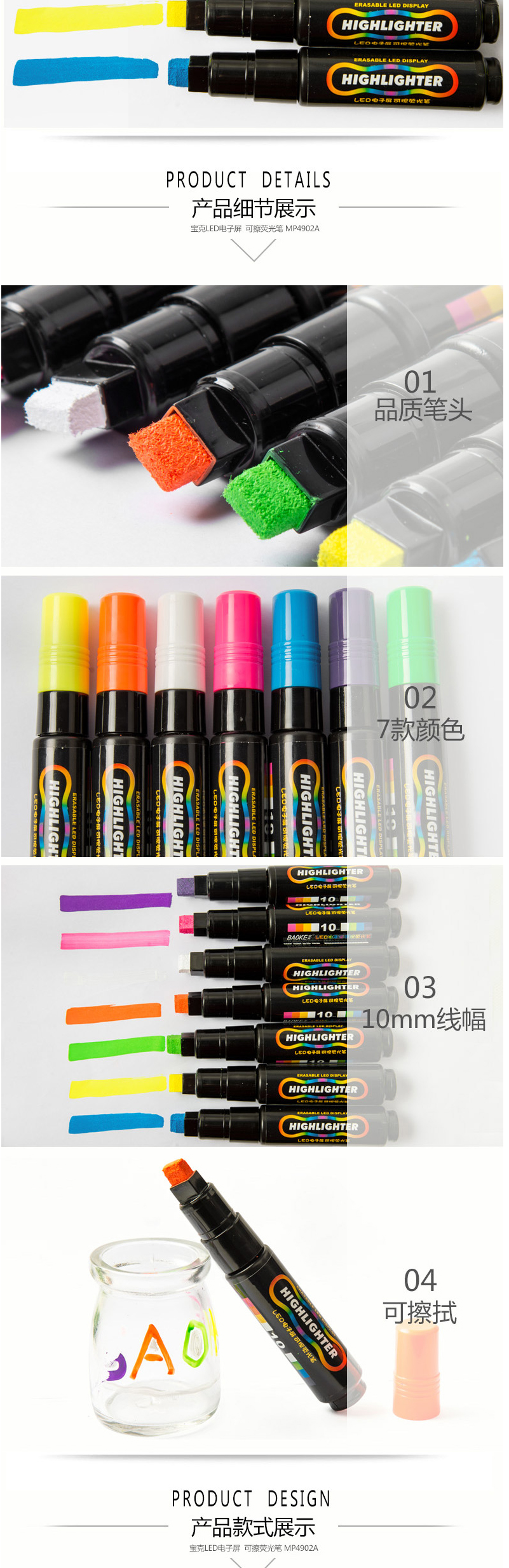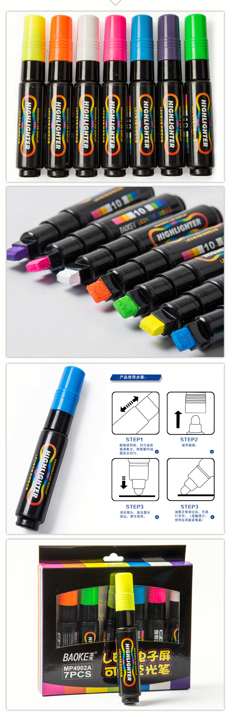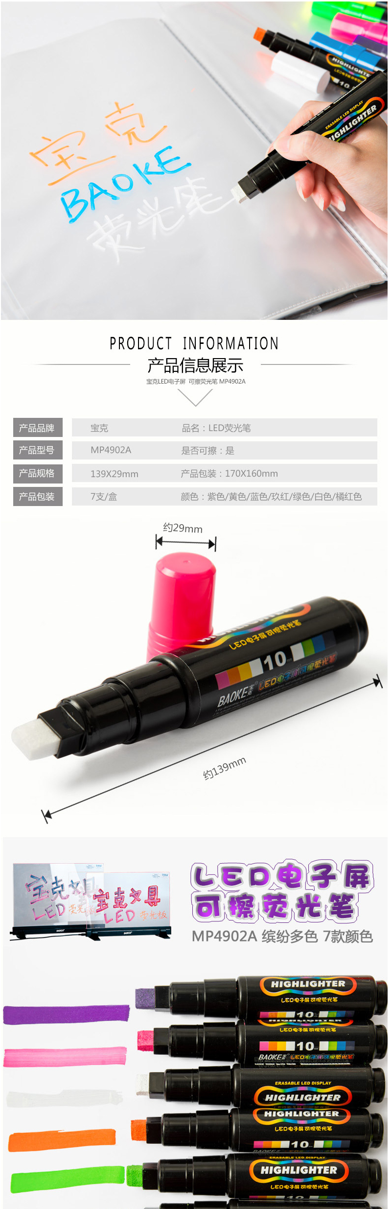 • 商品名称:宝克(BAOKE) MP4902 LED电子屏可擦荧光笔 平头 7色 彩色记号笔荧光板笔(黄色)