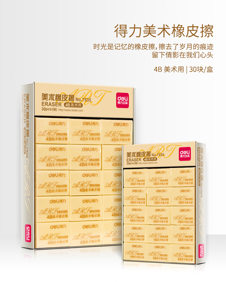 • 商品名称:得力(deli) 7534-1 学生美术4B橡皮擦 32*22*13mm/块 30个/盒