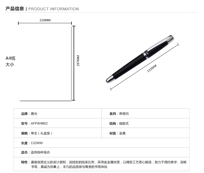 • 商品名称:晨光(M&G) AFPW4802 金属钢笔 商务办公签名希格玛钢笔 黑色