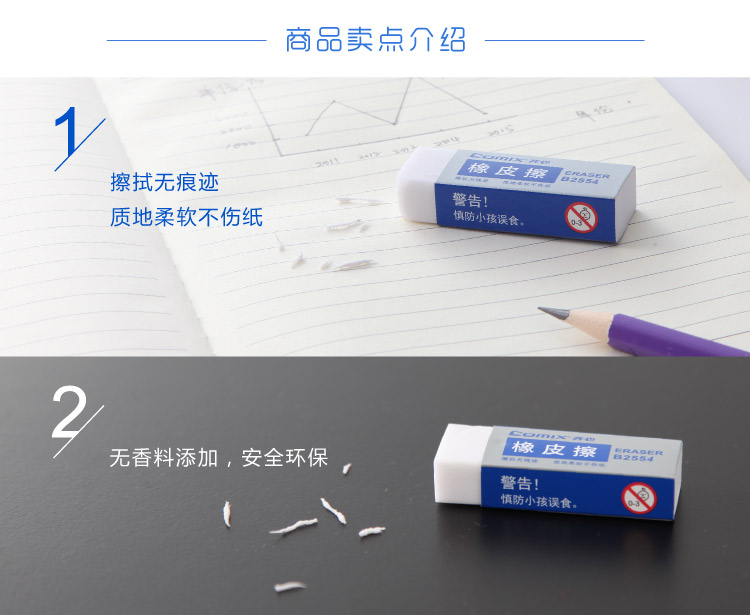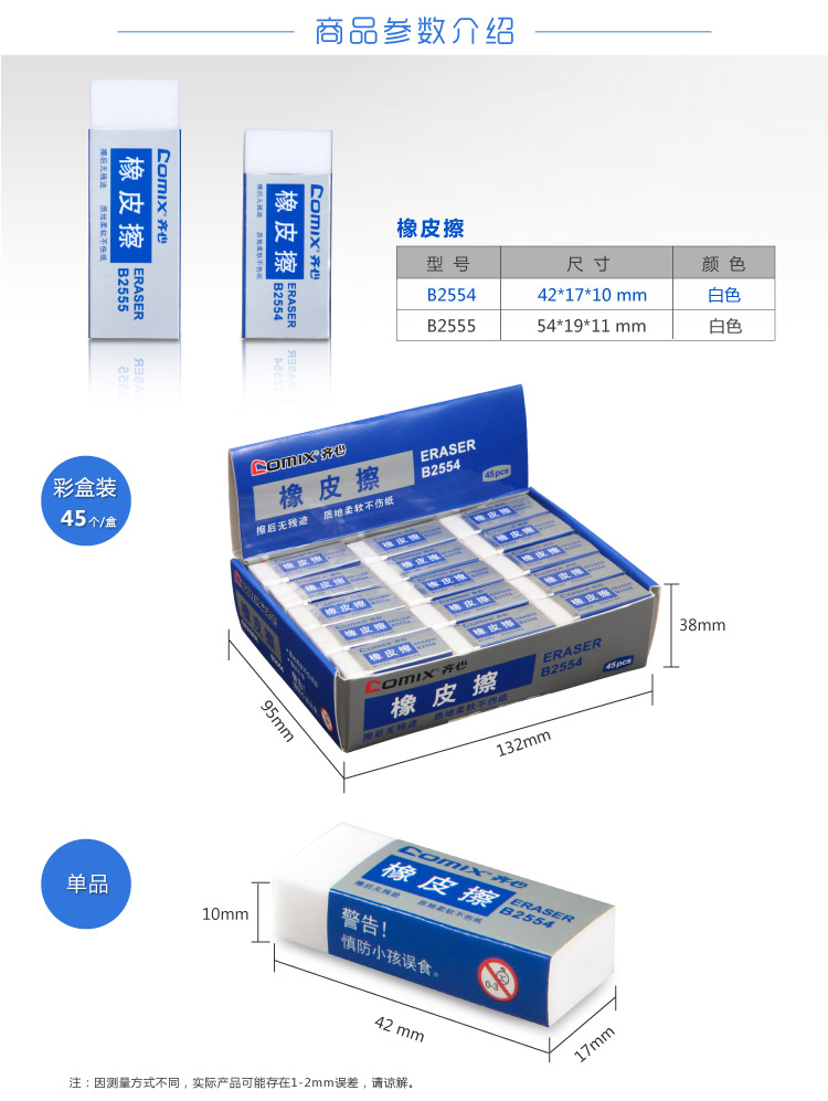 • 商品名称:齐心(COMIX) B2554 2B橡皮擦考试美术办公橡皮42*17*10mm 白色 45个/盒