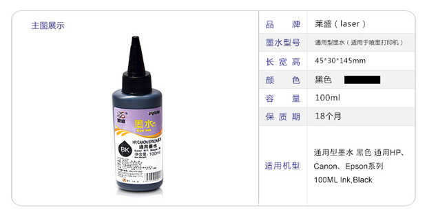 • 商品名称:莱盛(laser)通用型墨水 黑色(通用惠普、佳能、爱普生喷墨打印机)