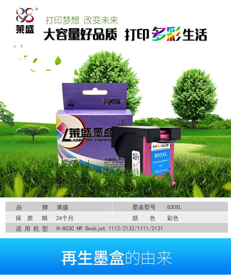 • 商品名称:莱盛(laser)H-803XL 彩色墨盒 打印机耗材墨盒(适用于惠普HP Deskjet 1110/1115/2130/2135/3630/3830/4650/4520)