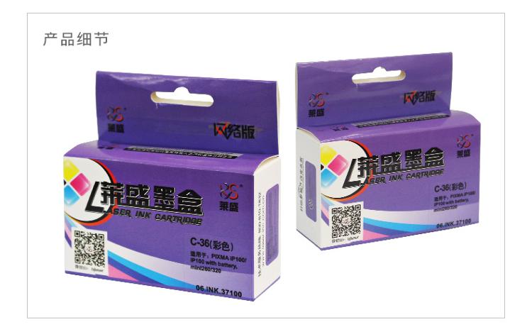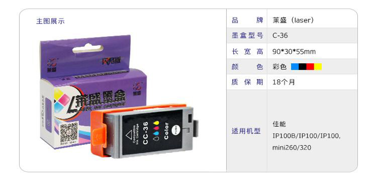 • 商品名称:莱盛(laser) C-36 喷墨打印机彩色墨盒(适用于 佳能IP100B/IP100/IP100/mini260/320)