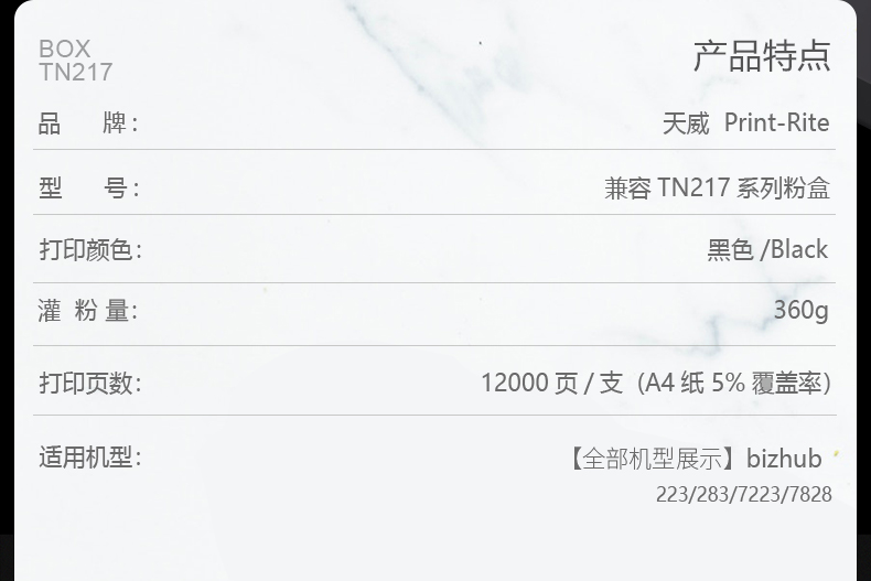 • 商品名称:天威(PrintRite) TN217粉盒 适用柯尼卡美能达223 283 7828 7223