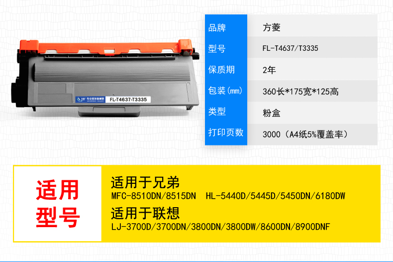 • 商品名称:方菱(FangLing) FL-T4637/3335 粉盒 适用于联想 LJ3800DW 3700DN M8600 M8900DN 3800D 3700DN